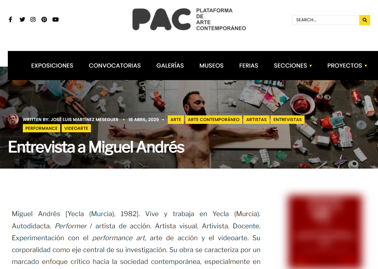 En la entrevista hablo del arte y la performance como una necesidad vital, no como un lugar de éxito o reconocimiento, sino como un espacio de supervivencia, de resistencia y de sentido. Mi práctica nace del cuerpo, de la experiencia vivida, de la fragilidad, del deseo y también del conflicto. El cuerpo aparece como territorio político, como archivo de tensiones sociales y como herramienta para pensar el mundo que habitamos...